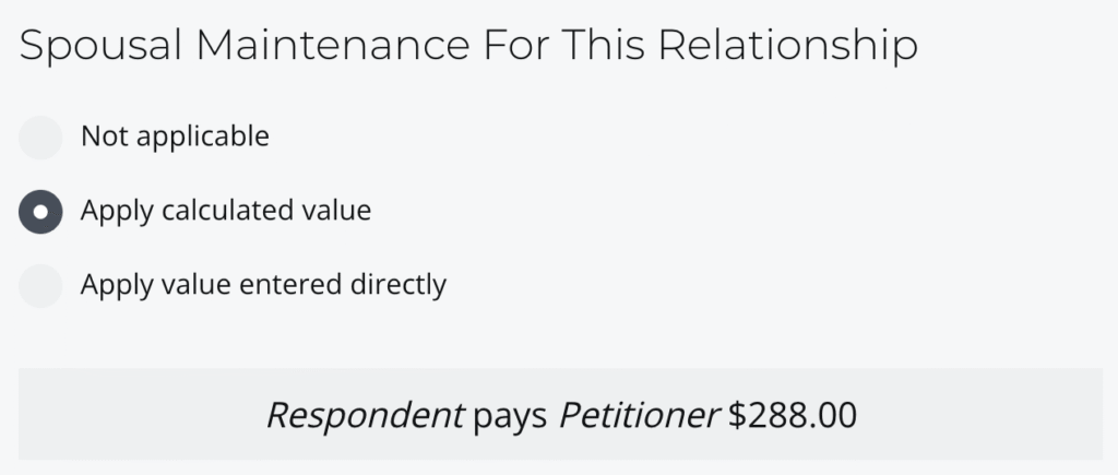 When spousal maintenance for this relationship applies, the calculator offers two ways to include this information. If you would like the application to calculate spousal maintenance based on the information entered for child support, select Apply calculated value. This option will apply the spousal maintenance obligation calculated from the income information you have entered and allow you to export a Spousal Support worksheet later on.