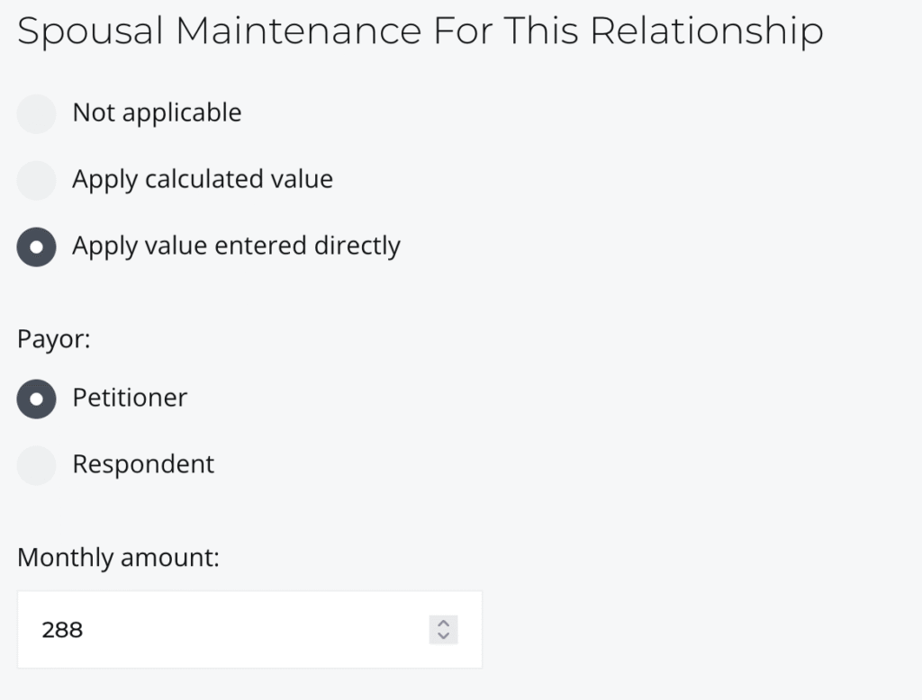 If you would like to enter a value that is different from the one calculated using the statutory formula, select Apply value entered directly. This option is appropriate if there is an existing spousal support order in place, or if you are exploring different scenarios or negotiating options. When applying value directly, select the Payor party and enter the Monthly amount.