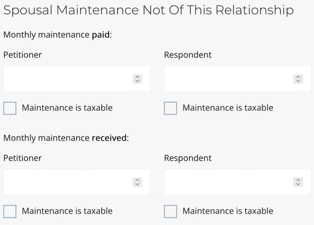 If either party pays or receives monthly spousal maintenance for a different relationship, enter the amount actually paid in the appropriate input. Make sure you check the “taxable” box if the spousal maintenance from the other relationship is taxable to the recipient and deductible by the payor.