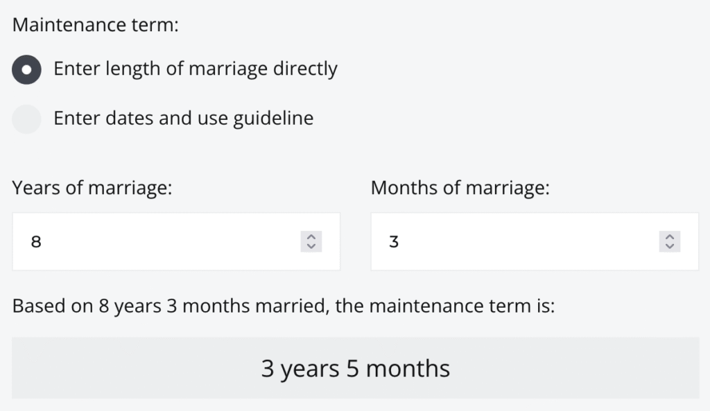 If you selected the Apply calculated value option and intend to export the Spousal Support worksheet, make sure to enter the maintenance term inputs. The maintenance term is the length of time the spousal support is effective for. The term is based on the length of the marriage and it can be entered by either the length of marriage directly, or the start and end dates of the marriage. Once entered, the calculator will display the resulting maintenance term based on the guideline. Pursuant to section 14-10-114(3.5), the Court may consider the guideline term or duration of maintenance for higher income parties, even if the parties’ combined incomes exceed the guideline cap.