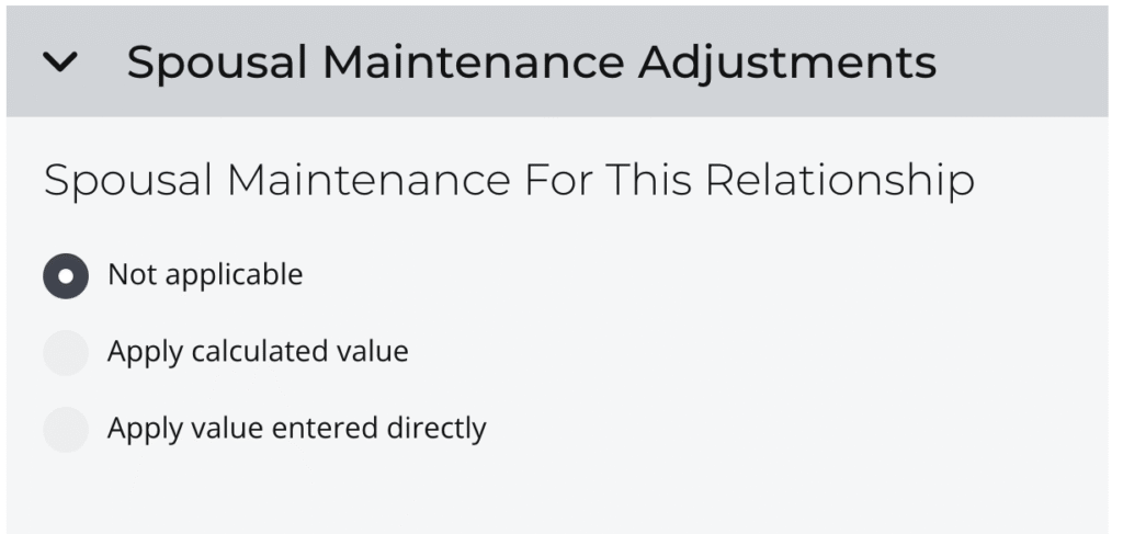 Click on > Spousal Maintenance Adjustments to open up the section. The first subsection to review is Spousal Maintenance For This Relationship.