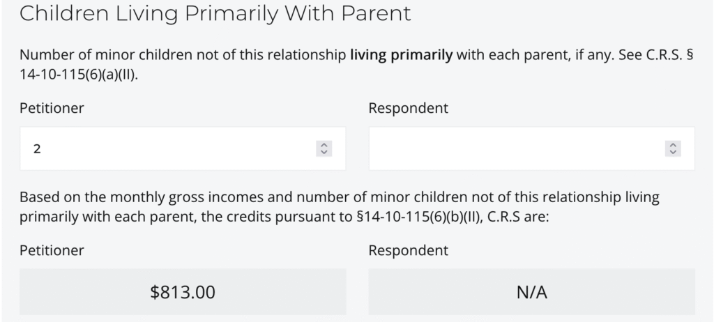 If the party does not pay court-ordered child support because the party is the primary residential parent of the non-joint children, enter the number of minor non-joint children not of this relationship living primarily with each party. Remember, this is for children for whom the party has a legal responsibility to financially support – this typically would not include step-children unless the party has legally adopted them. If the non-joint children are living with the party in this case and with their other parent equally (50/50), that typically counts, but if that party is also paying court-ordered child support for those children, you could not receive credit both ways. When you list the number of non-joint children living with each party, the calculator will display the appropriate amount of credits, pursuant to the formula established by section 14-10-115(6)( b)(II), C.R.S..