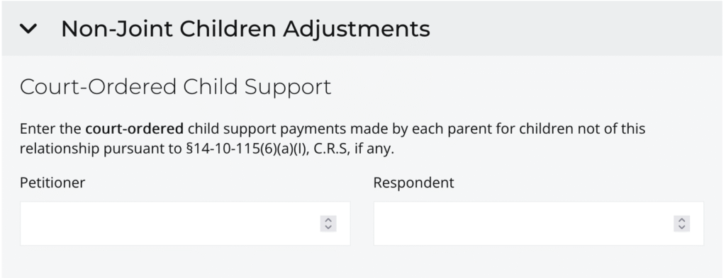 Click on > Non-Joint Children Adjustments to open up the section. The first subsection to review is Court-Ordered Child Support.