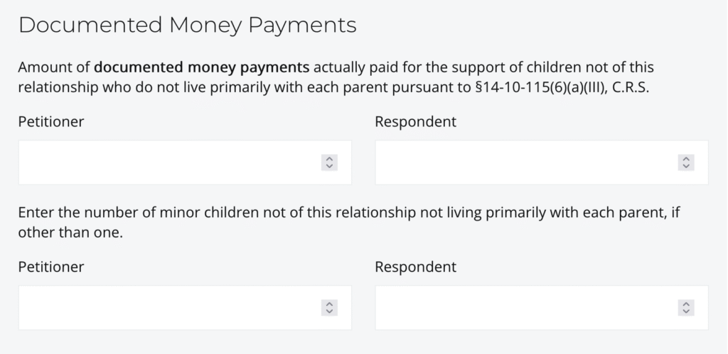 If the non-joint children do not live primarily with the party and there is no court-ordered child support, enter the amount of documented money payments that party actually pays for the support of the non-joint children each month. Be prepared to show the other party and the court documentation showing these money payments – if there is no documentation of the money payments, the credit would not apply. The amount of documented money payments for this credit cannot exceed the credit the party would receive pursuant to the formula established by section 14-10-115(6)( b)(II), C.R.S. The calculator assumes there is at least one child when these fields are entered, but if the documented money payments are for more than one child, make sure you specify the number of children so that the cap is applied appropriately.
