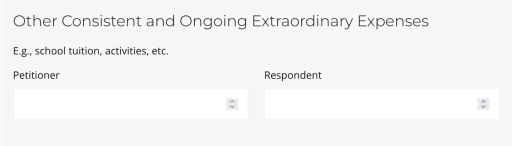 Please note that only ongoing and consistent extraordinary expenses should be included in the child support worksheet. C.R.S. § 14-10-115(10)(h)(I). If the expense is NOT the same amount each month or NOT expected to continue for a while, the expense should not be included on the worksheet, and thus should not be included in the calculation as an adjustment. In such instances, the parties are expected to reimburse each other for the expense outside of the regular monthly payment. If the expense will continue to be a regular monthly expense at a predictable amount each month, it may be appropriate to include the expense on the worksheet and the amount paid by a party should be entered into the calculator.