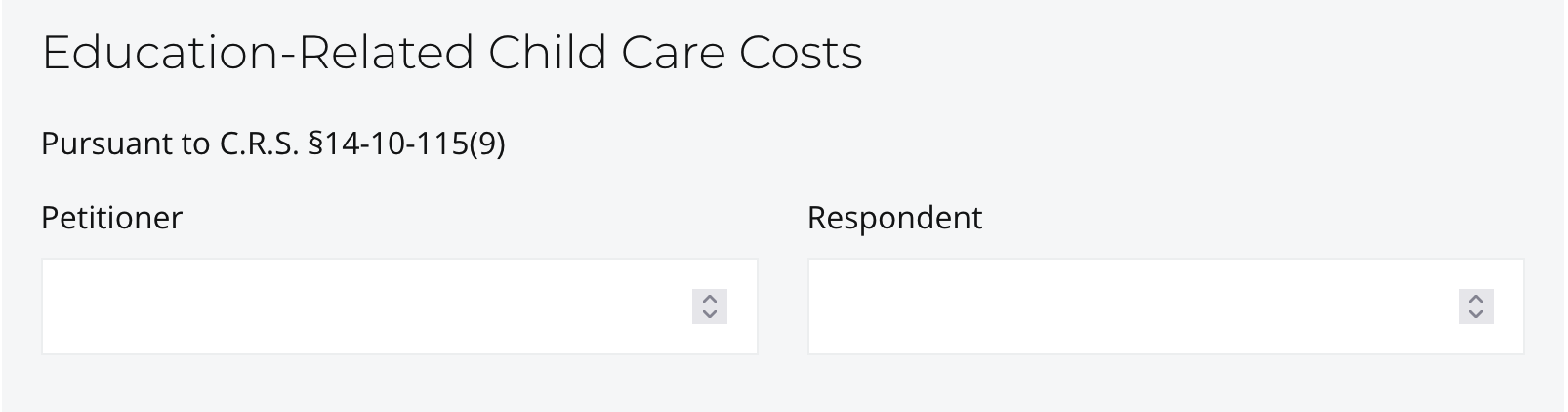 If the child-care costs are for the party’s pursuit of employment or education, the federal income tax credits would not be applicable, as they would be for work-related child care costs. For this category, enter the full amount paid by the party in the subsection specifically for education-related child care costs, and the calculator should apply the adjustment as entered. As noted above, for purposes of this adjustment, the statute caps the costs at “the level required to provide quality care from a licensed source.” § 115(9). There is no specific price limit for this in Colorado’s statutes – it will depend on the costs for such licensed care available in the applicable area.