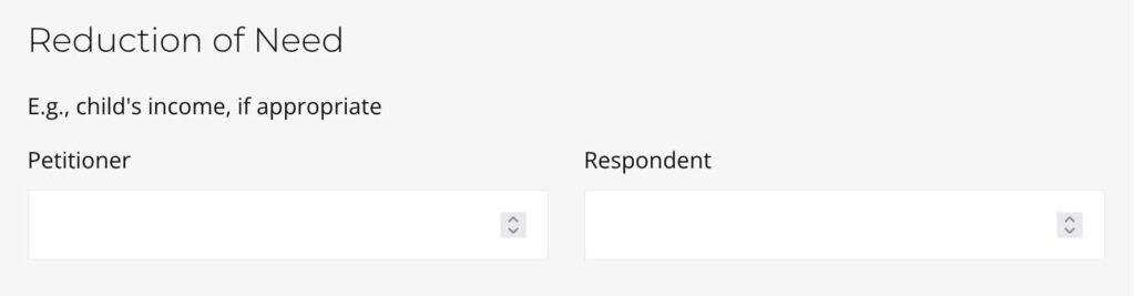 There are instances in which a parent or child receives funds or other benefits which may reduce the child’s financial needs. While this is not common and typically subject to the Court’s approval, if there is a reduction of need received by one or both parties on behalf of the child, such reduction of need could be added here in the “reduction of need” subsection. Including a reduction of need in this subsection would allocate the reduction of need across both parties’ support obligations in proportion to their incomes. Examples may include a child’s trust income, a child’s employment income, scholarship, or other consistent and quantifiable income/benefit. Do keep in mind that whether a particular benefit or a child’s income reduces the child’s needs is subject to the judge’s discretion. C.R.S. § 14-10-115(11)(b). By way of example, if a judge concludes that the child’s income is being saved for post-secondary education or used by the child for the child’s own discretionary spending or vehicle use, the judge may elect to exclude the child’s income from affecting the parties’ child support obligation. There is no bright-line rule on this category – it depends on what the Court determines to be a reduction of need or not.