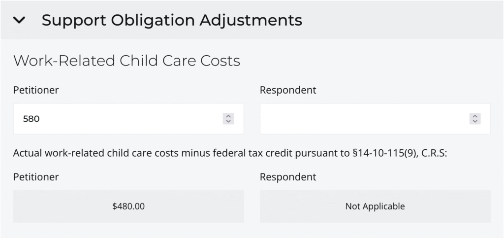 When entering work-related child care costs, federal income tax credits for child care must be subtracted, pursuant to section 14-10-115(9), C.R.S.. Enter the full amount paid; our calculator will subtract the federal income tax credits and the resulting adjustment will be displayed below. Please note that, for purposes of this adjustment, the statute caps the costs at “the level required to provide quality care from a licensed source.” § 115(9). There is no specific price limit for this in Colorado’s statutes – it will depend on the costs for such licensed care available in the applicable area.