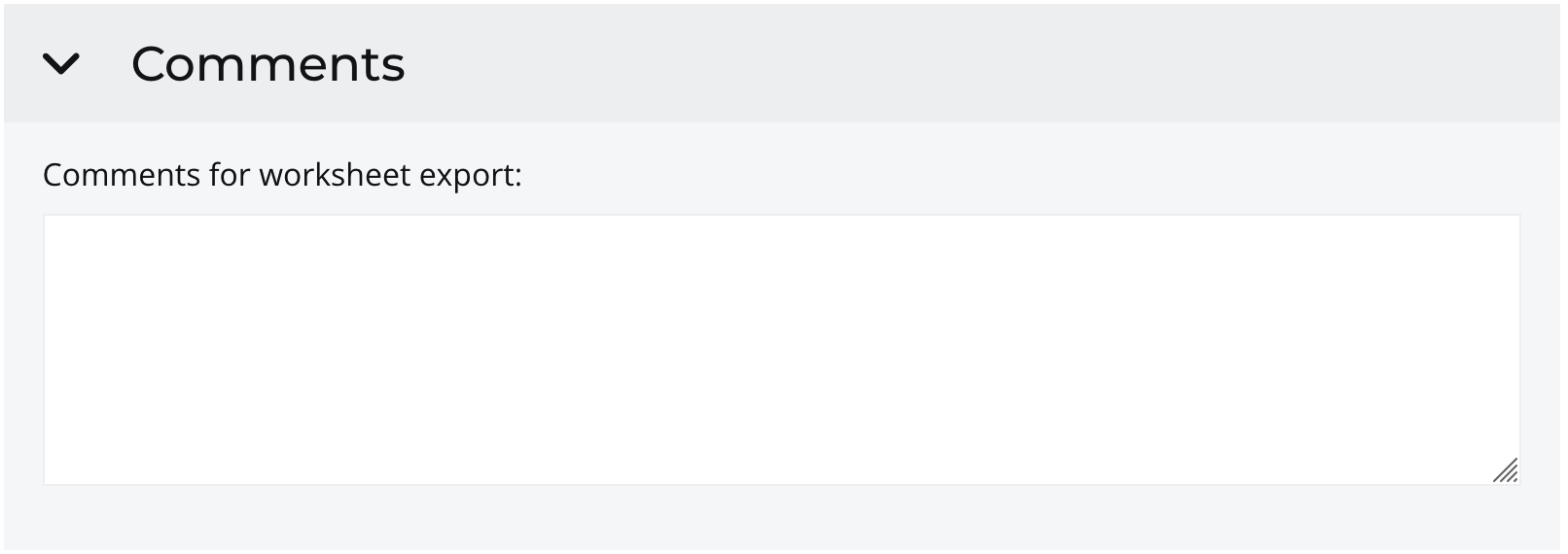 Click on > Comments to open up the section. Include here any additional information or comments relevant to the calculation that were not captured in the previous entry fields. The text entered into this field will be included in the worksheet PDF export in the Comments section. Do NOT include any comments you want to keep private.