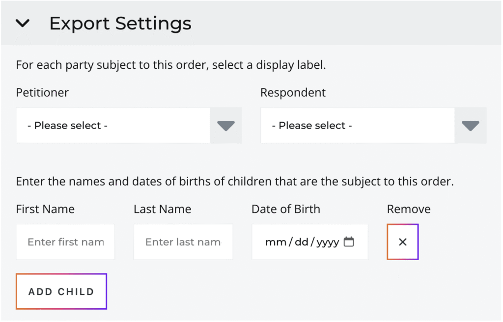 If you’d like the child support worksheet you export to display each party with a label other than Petitioner or Respondent, select your preference here. The next set of inputs allow you to enter the details for the children subject to this support order. First ensure the correct number of children is accounted for. Use the ADD CHILD and Remove X buttons to add or remove rows as needed. There should be a row for each child. Then enter the First Name, Last Name, and Date of Birth of each child.