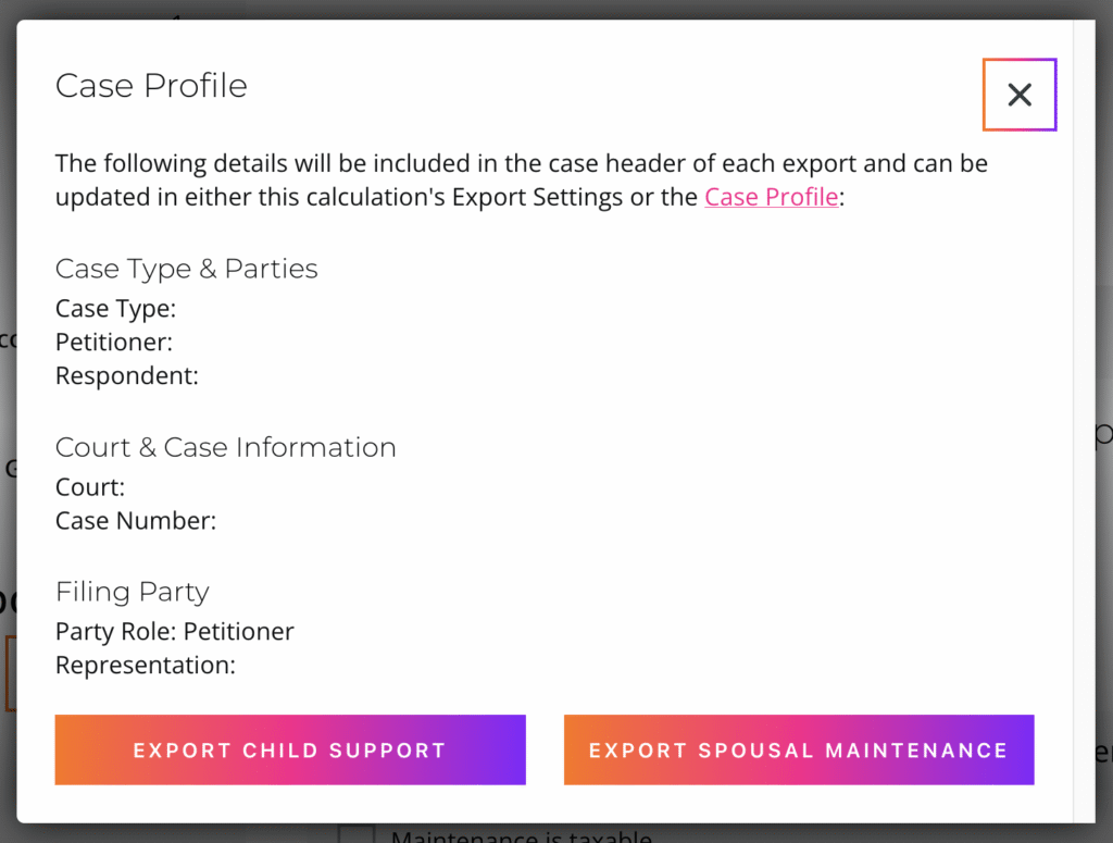 Export settings allows you to input the subject children’s information for the worksheet and change how the parties’ names are displayed in the child support calculation. Click on > Export Settings to open up the section.