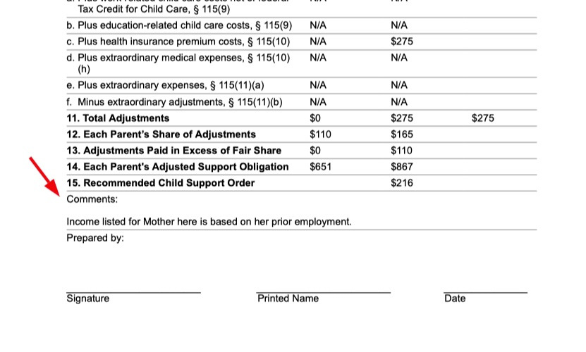 Comments entered in this section appear at the bottom of the child support worksheet, just above the signature line: